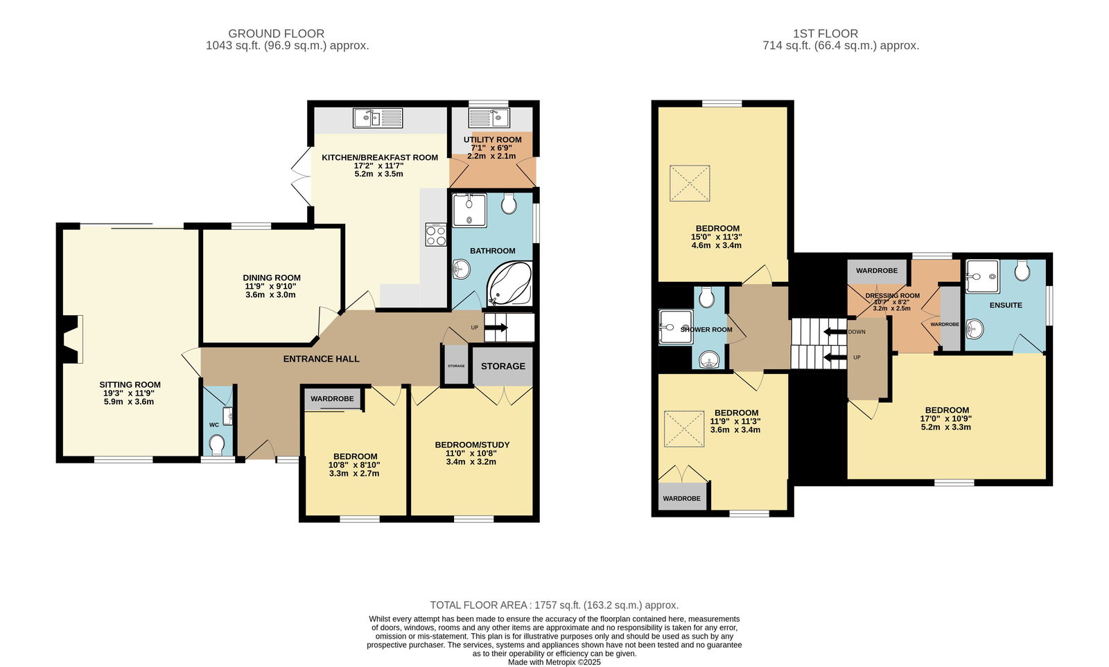 The accommodation comprises on the ground floor an entrance hall, cloakroom, sitting room, dining room, breakfast kitchen with French doors to the garden, utility room, two bedrooms and a family bathroom. To the upper ground floor is a master bedroom with en-suite shower room and a further bedroom / dressing room. A staircase leads to the first floor with a spacious study landing, two bedrooms and a shower room.