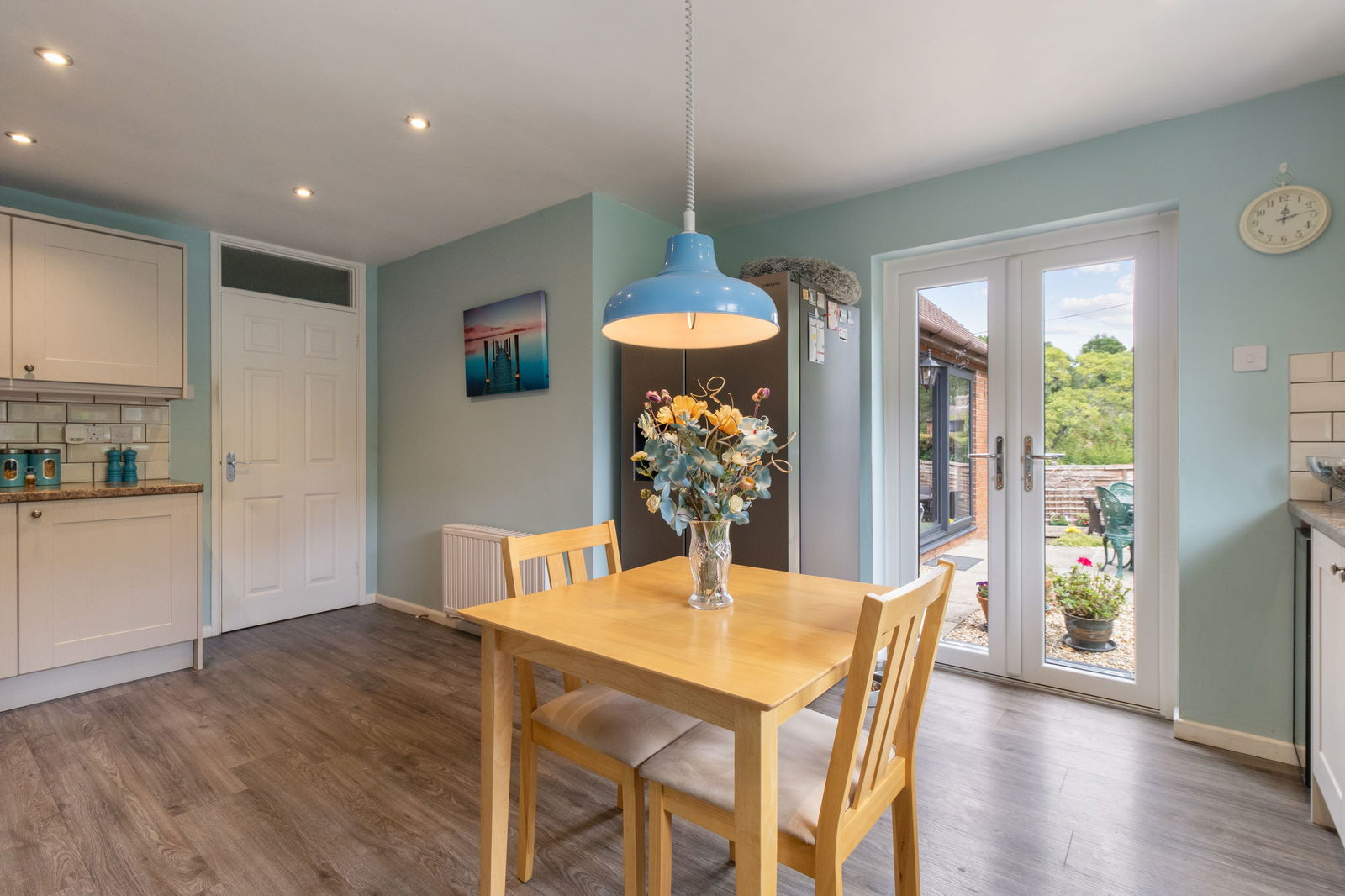 With double glazed widows to rear and French doors opening onto the garden. Re-fitted with a range of contemporary units comprising, wall and base cupboards with one and a half bowl sink/ drainer unit with tiled splash backs and worksurfaces over. Integrated NEFF double oven with induction hob and extractor hood over. Space for fridge freezer. Ceiling downlights. Radiator. Door to: