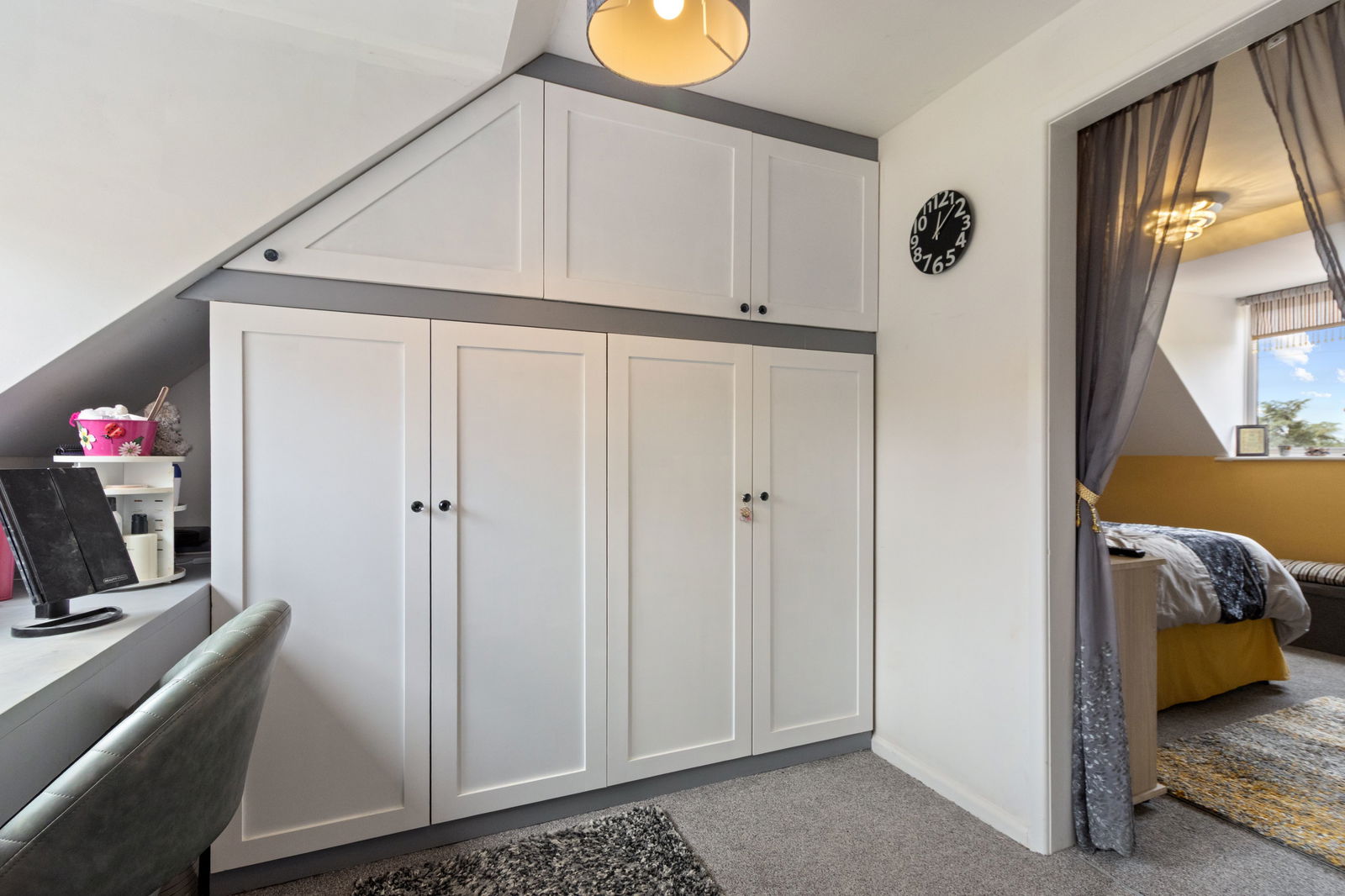 With sloping ceiling. A range of built-in wardrobes, drawers and seating area. Radiator. Velux window and attractive double glazed feature porthole window to front.