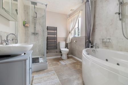 Suite comprising corner jacuzzi bath. Walk-in shower cubicle with mains shower. WC. Vanity unit with inset wash hand basin. Ladder radiator. Extractor fan. Tile effect flooring. Double glazed window with obscured glass.