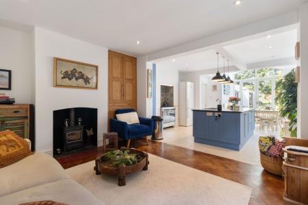 A thoughtfully extended open plan family and socializing space with a seating area benefitting from four spot down lights. Double glazed window to the side aspect. Fireplace with inset log burner and a tiled hearth. Under stairs storage cupboard. Built in Larder cupboard. Parquet flooring. Fuseboard. Open through into...