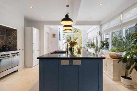 Bespoke handmade kitchen with feature breakfast island with undercounter storage cupboards, drawers and integrated dishwasher. Benefitting from a granite countertop with inset sink and half sink unit with a chrome tap. Three light pendants and six spot down lights. Four double glazed windows to the side aspect. Pantry cupboard. Free standing 'Kenwood' range style electric double oven with five ring gas hob with a tiled backsplash and over head extractor fan. Space for fridge freezer. Tiled flooring connecting the space into...