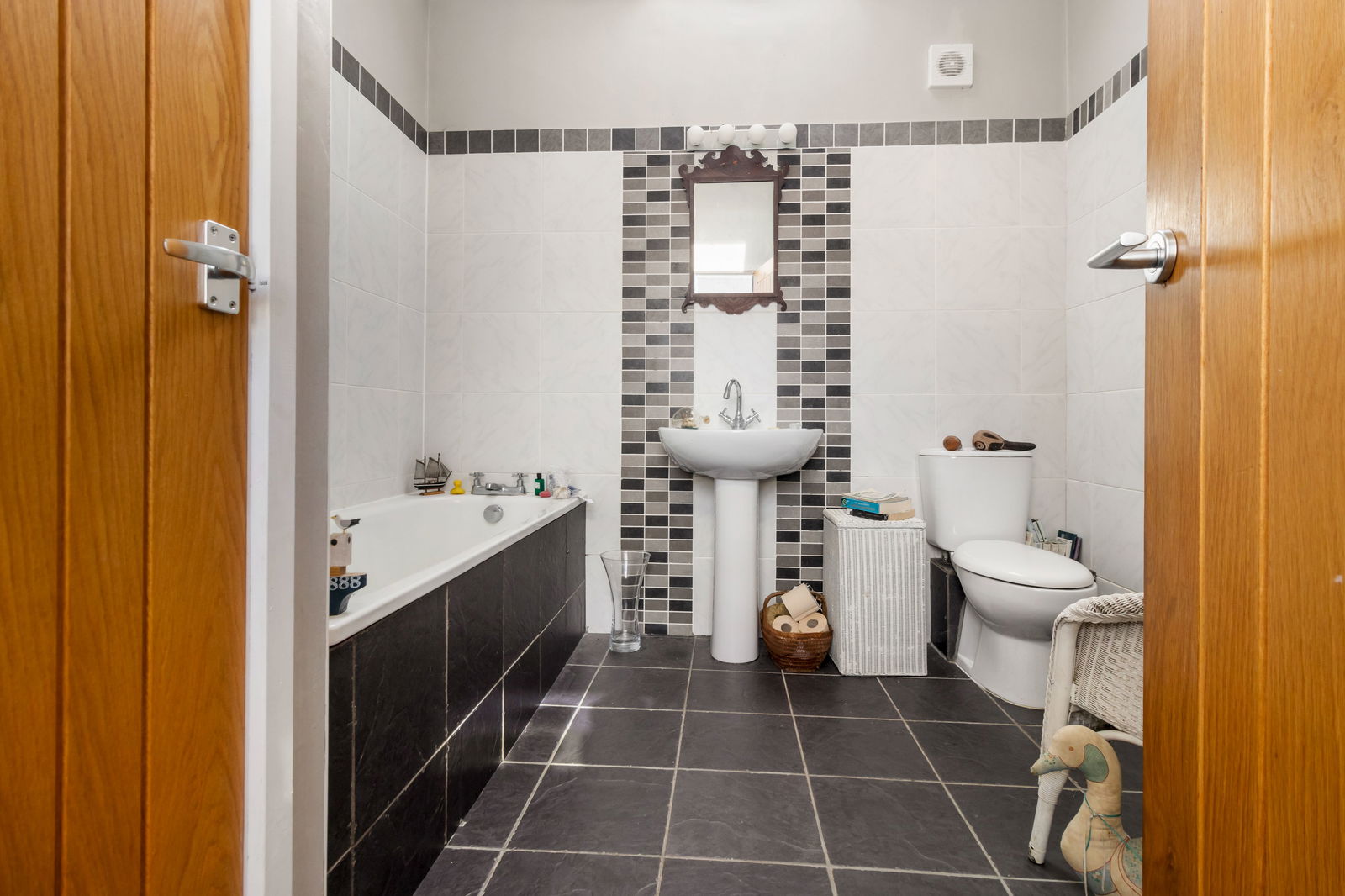 Tiled floor, extractor, Velux window, ceiling light fittings, bath, wash hand basin, low level WC, heated towel rail, shower cubicle with mains powered showed, airing cupboard with pressurised hot water cylinder