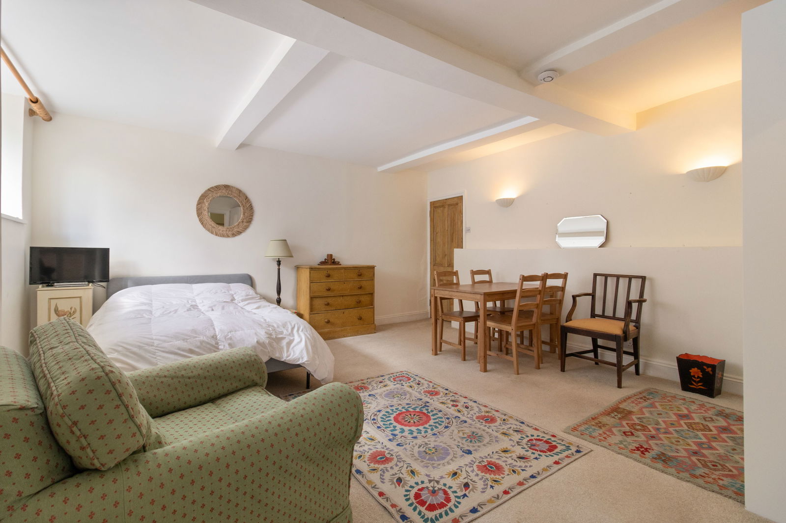 Attractive vaulted ceiling with exposed painted timbers. Feature port hole window with fitted shutters. Double glazed multi paned sash window enjoying a fine outlook over the garden. Radiator. Carpet.