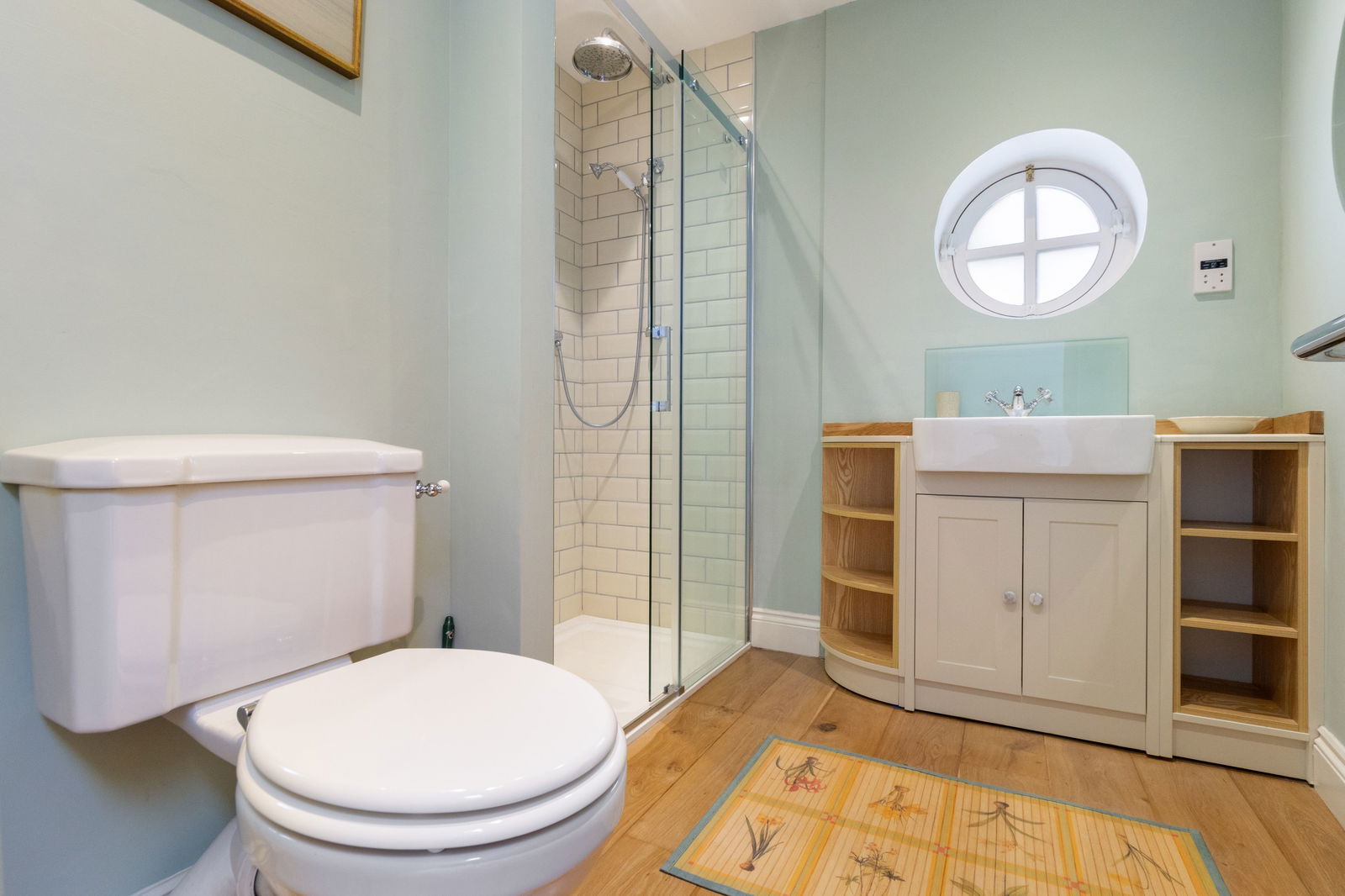 Re-fitted with tiled walk-in shower with raindrop shower and hand held attachment. WC. Vanity with inset wash hand basin and glass splashback. Shaver point. Ladder radiator. Wood flooring. Feature port hole window with obscured glass. Extractor fan. Downlights.