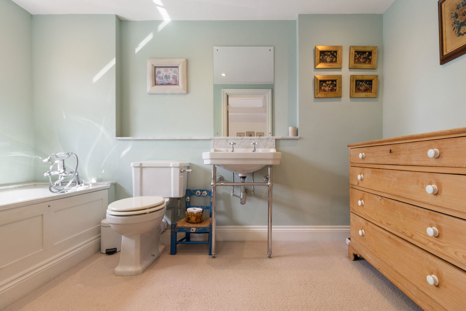 Panelled bath with mixer tap and shower attachment. Tiled surrounds. WC and wash hand basin. Traditional towel radiator. Inset spotlights.