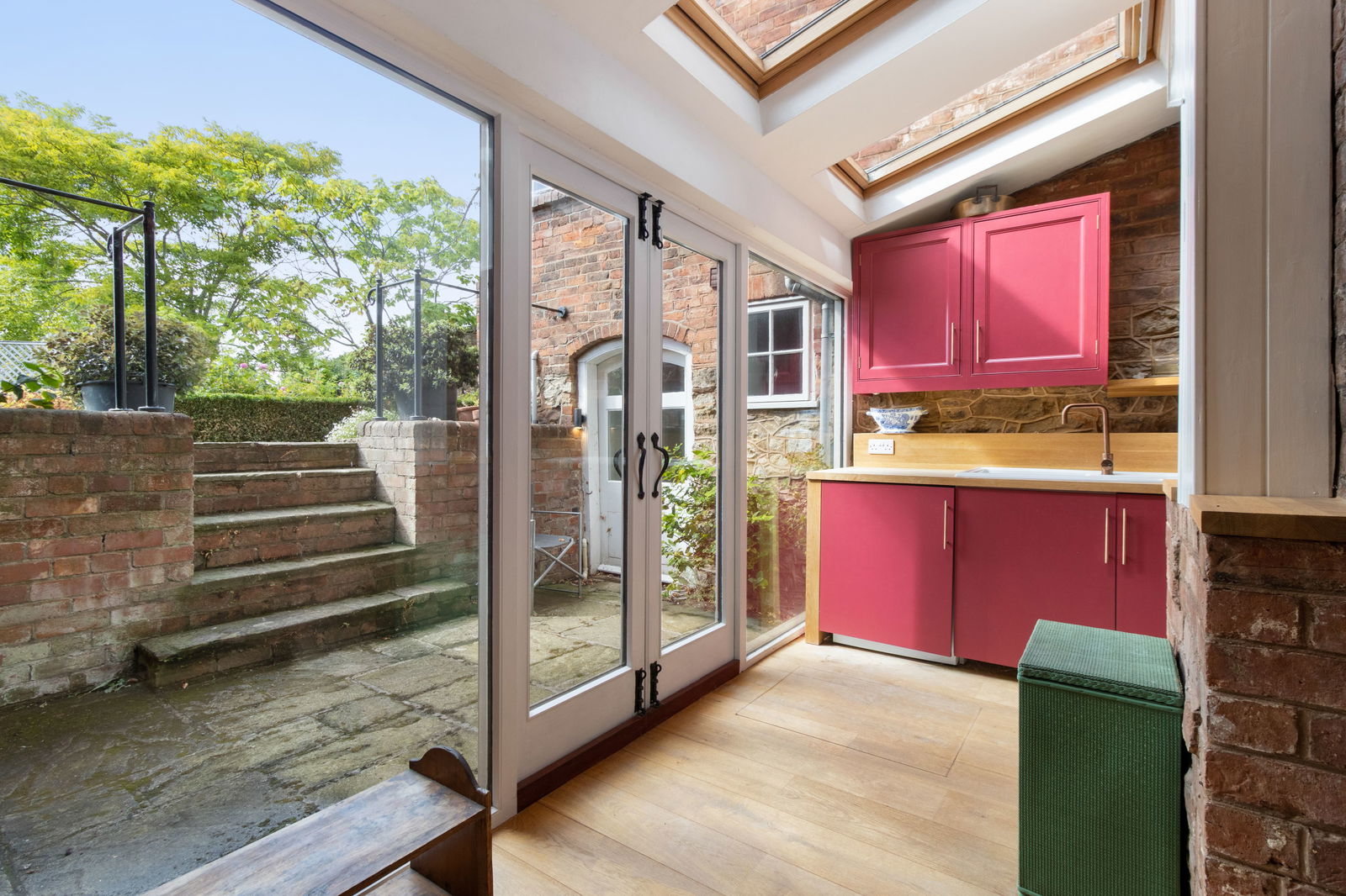 Painted wall and base units with plumbing for washing machine and space for tumble dryer. Belfast style sink and drainer. Solid wood worksurfaces with upstands. Wood flooring. Double glazed windows and French doors leading to patio and garden. Feature vaulted brick archway leading to: