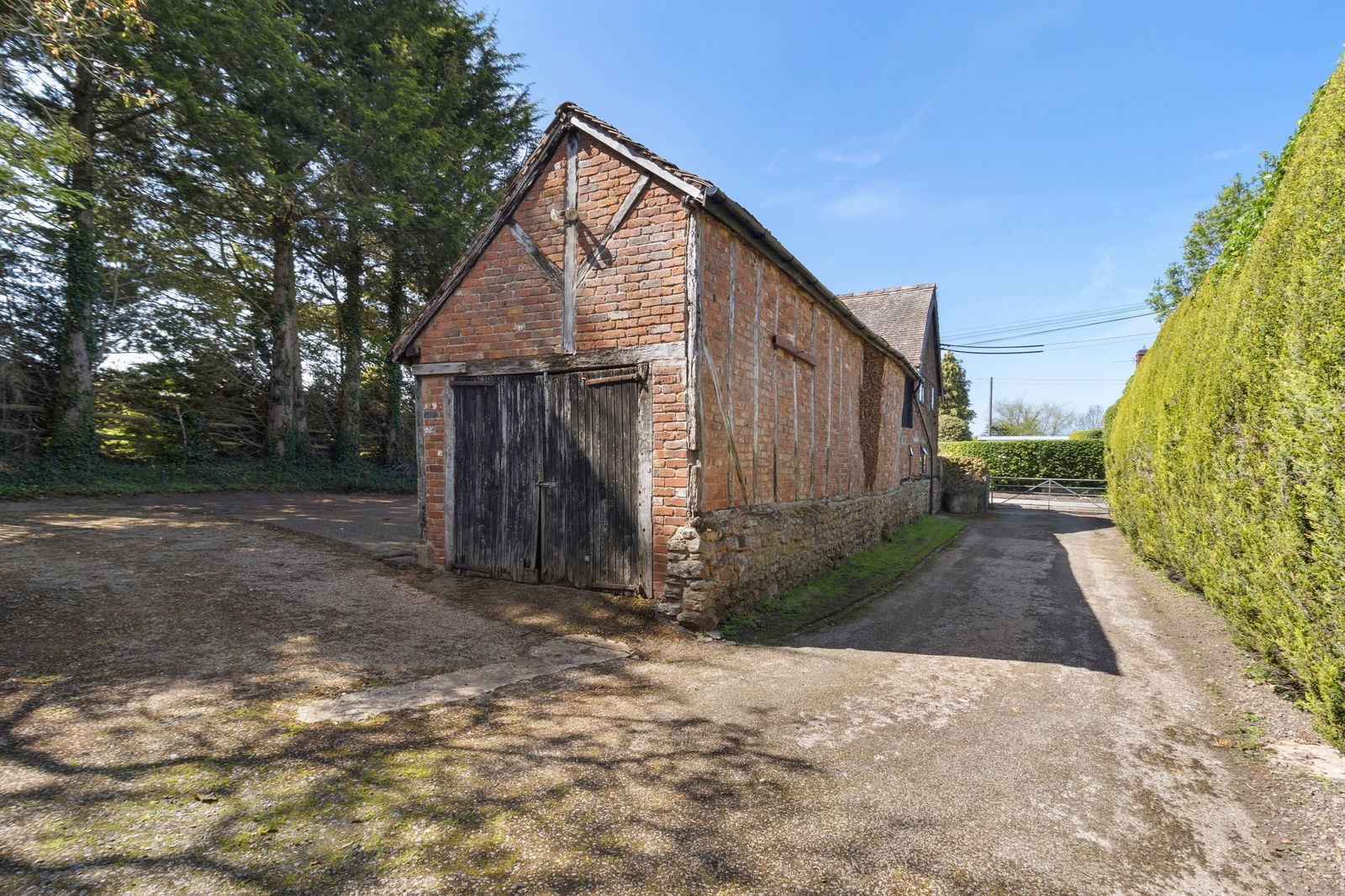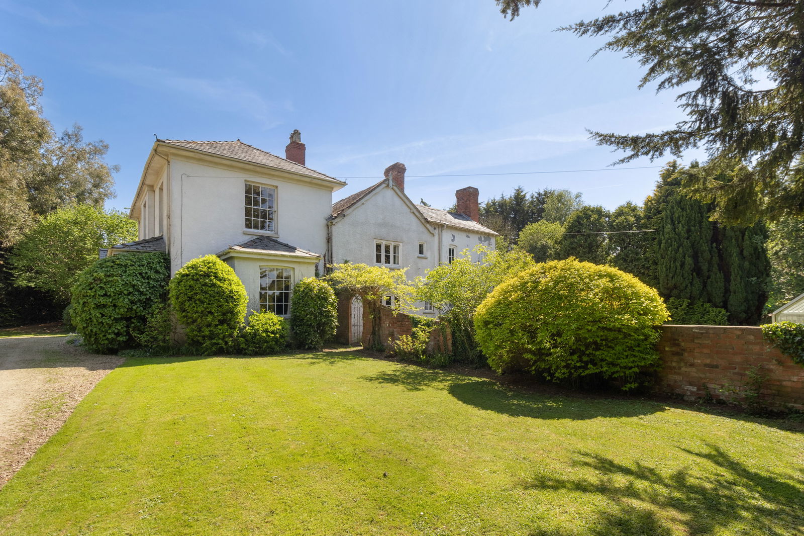 The Old Rectory is approached via two separate gated driveways. The primary driveway leads to the front of the main house, where a lawn, mature trees, and ample parking create an impressive arrival. From here, there is access to both the front and rear gardens, as well as the surrounding land.