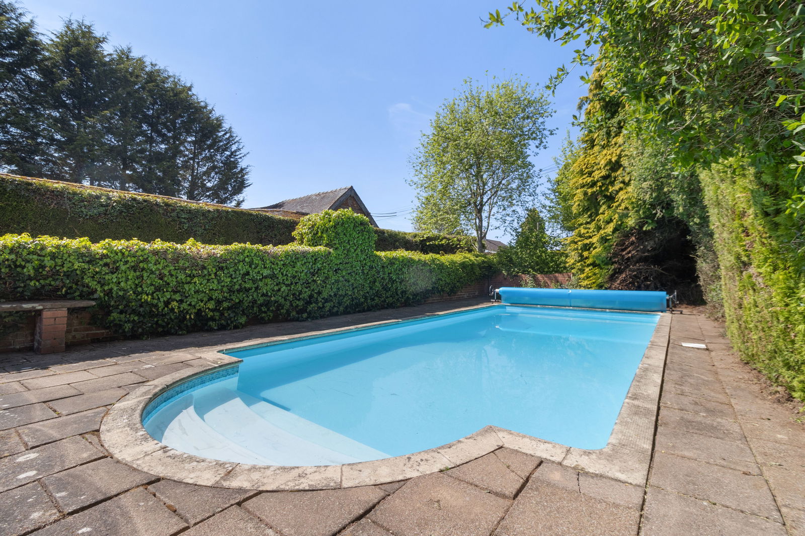 The rose/kitchen garden is attractively landscaped and can be reached via an ornate brick archway from the secondary driveway or directly from the main drive. This area features a generous lawn, greenhouse, and steps leading to a swimming pool with a spacious patio surround, ideal for outdoor entertaining. Mature trees and established hedging offer both privacy and a charming outlook.