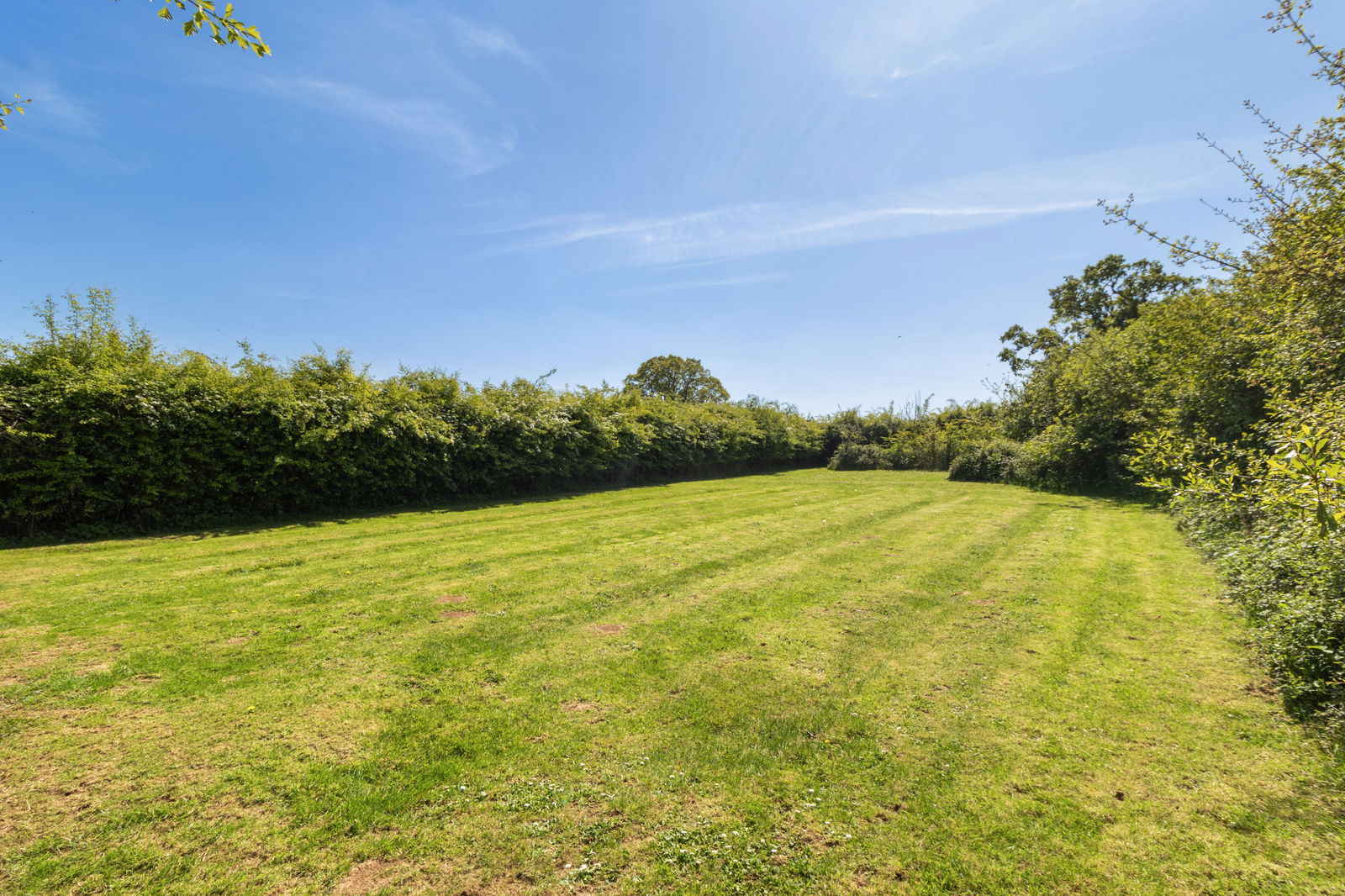 To the rear, the garden has been thoughtfully tiered to create distinct zones. A paved patio accessed via the kitchen offers space for al fresco dining, while steps bordered by well-stocked flowerbeds lead to a lawned area enclosed by a picket fence. A trellis archway opens to a one-acre paddock dotted with mature trees, beyond which a five-bar gate gives access to a former market garden. This in turn leads to the further 4.5 acres of land, all of which can also be accessed by vehicle via the secondary driveway.