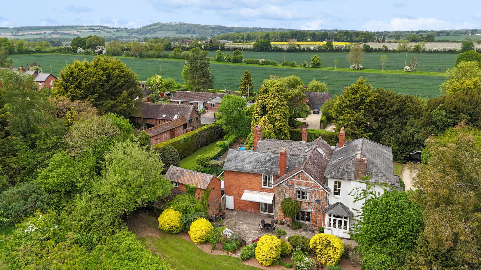The house stands within approximately two acres of mature gardens and grounds, featuring a large expanse of lawn, a swimming pool, beautifully established trees, a kitchen garden and stunning views over open countryside. A further four-and-a-half acres of adjoining paddock land are included in the sale, ideal for equestrian use, smallholding, or simply to enhance the privacy and lifestyle on offer.