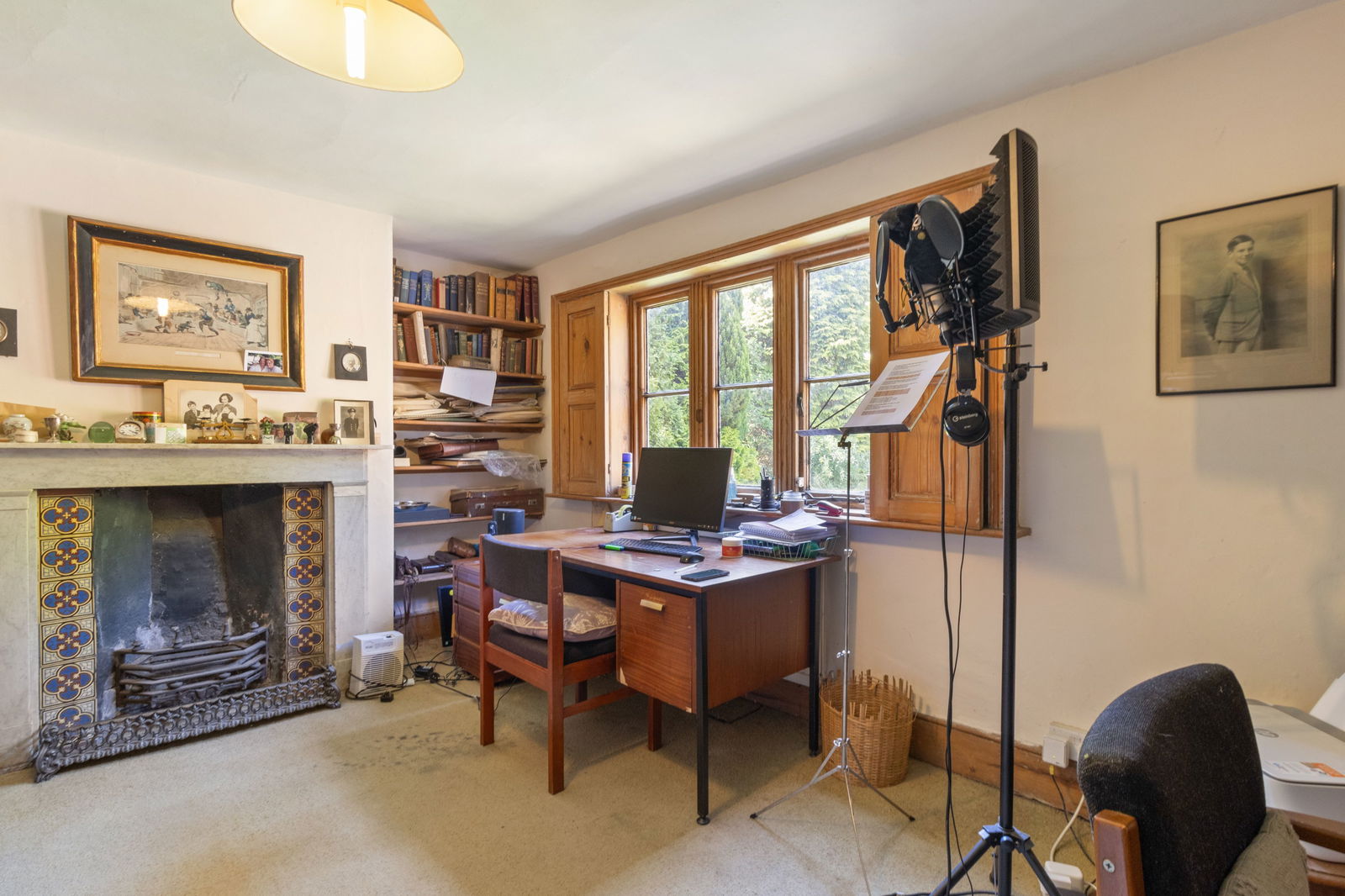 Window to rose/kitchen garden, fireplace and built-in storage.