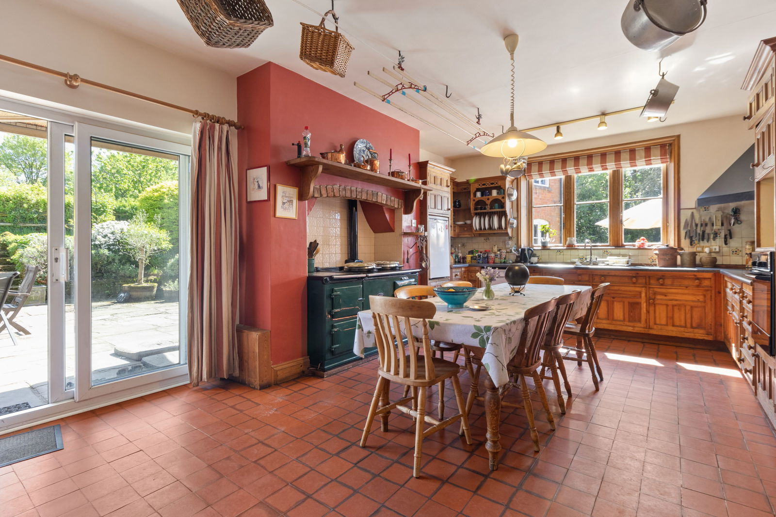Sliding patio doors to patio and garden, tiled floor, base and eye-level units over work surface, oil-fired four-door AGA, stainless steel sink and drainer, window to back garden, electric oven, space for dishwasher and fridge freezer. Electric hob.