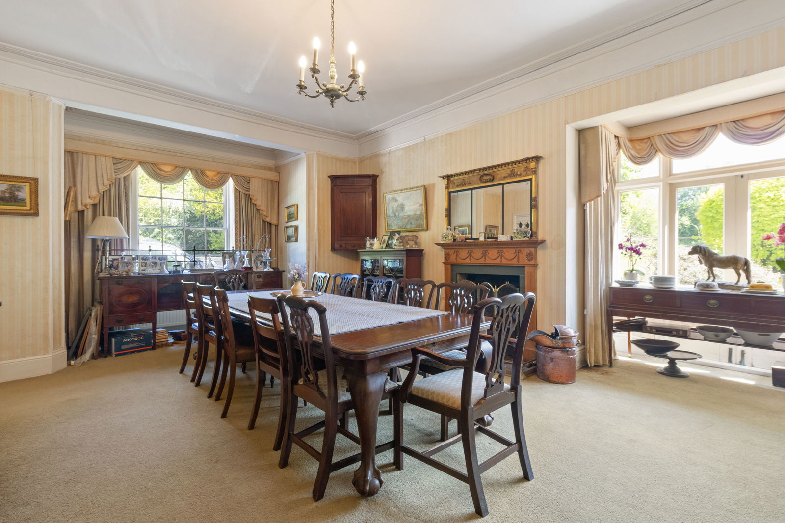 Sash window to side, door to patio and garden, fireplace and door to: