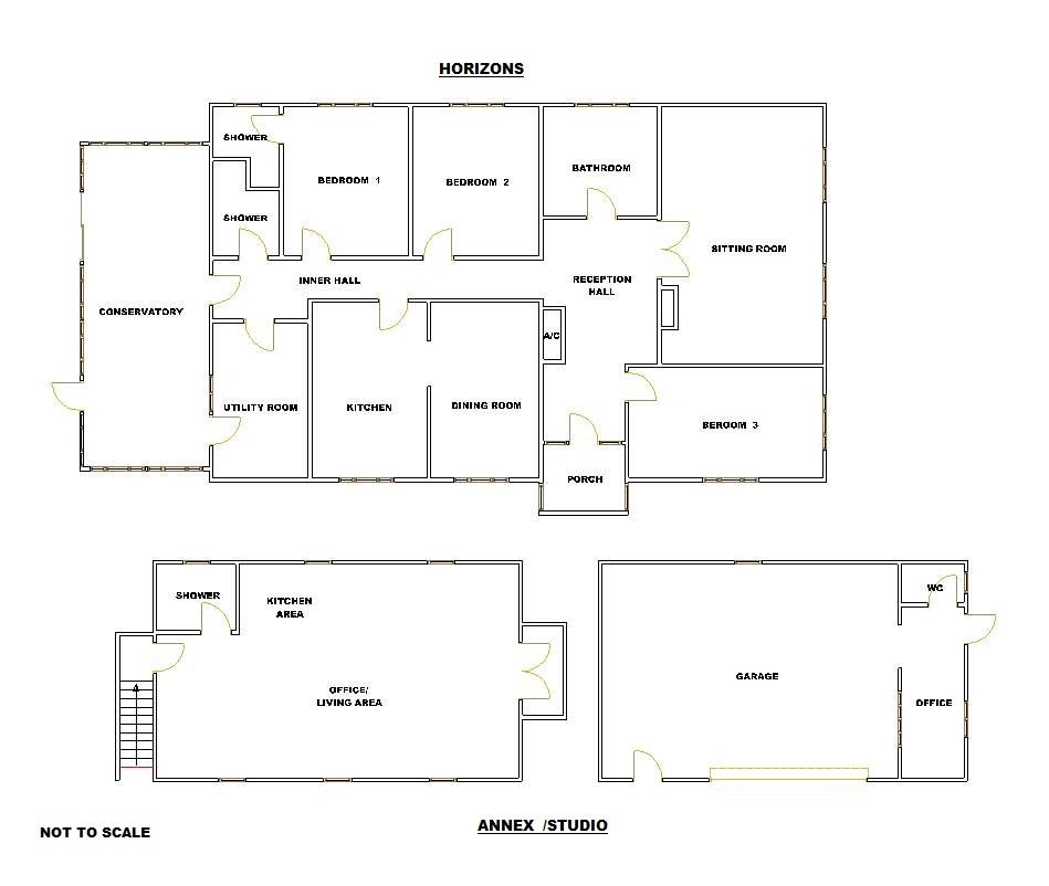 ENJOYING WONDERFUL VIEWS A MOST SPACIOUS 3 BEDROOMED DETACHED BUNGALOW WITH 2 RECEPTION ROOMS, CONSERVATORY AND 3 BATHROOMS STANDING IN A LARGE GARDEN EXTENDING TO JUST UNDER 1 ACRE AND HAVING A SELF CONTAINED DETACHED ANNEX / STUDIO WITH GARAGE AND A STABLE BLOCK WITH FURTHER ATTACHED GARAGING. NO CHAIN
