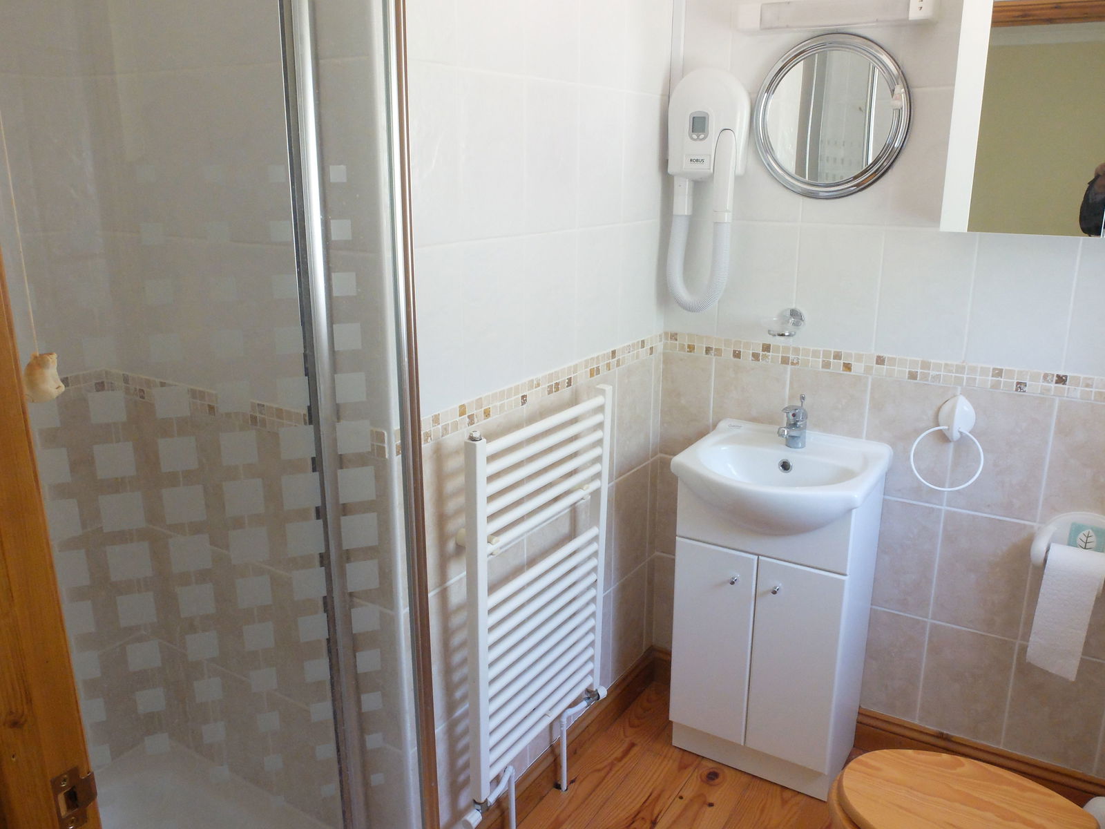 Fitted with a white suite comprising a shower cubicle, wash basin and a WC. Fully tiled surrounds. Tiled floor. Single radiator. Shaver point. Double glazed roof window.