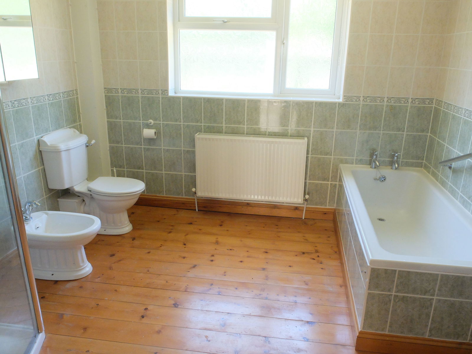 Fitted with a white suite comprising a bath, shower cubicle, wash basin, bidet and a WC. Fully tiled surrounds. Shaver point. Ventilator. Double radiator. Stripped floor. Double glazed window to rear.