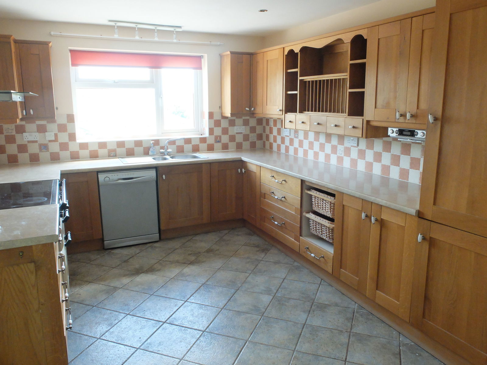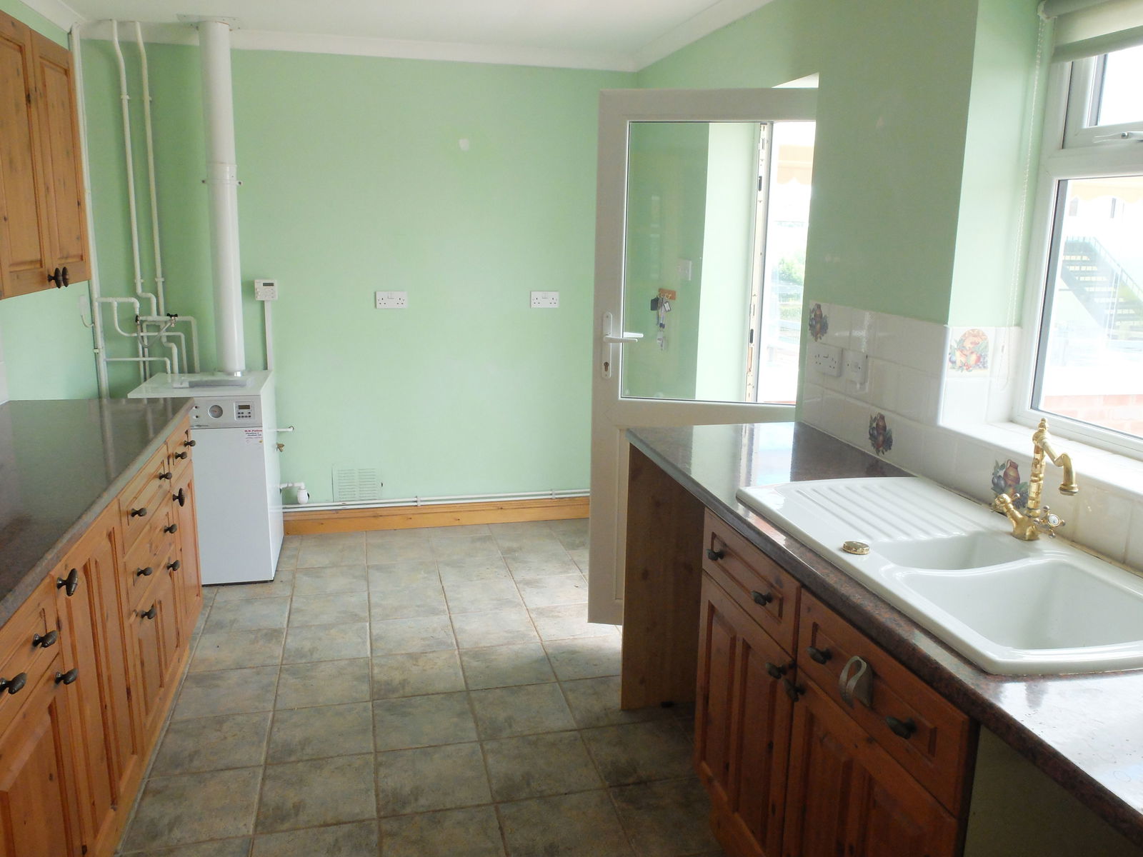 With enamel sink with base unit under. Further base units. Drawer pack. Wall mounted cupboards. Work surfaces with tiled surrounds. Plumbing for washing machine. Vent for tumble dryer. Oil fired central heating boiler. Double glazed window to side. Double glazed door to conservatory.