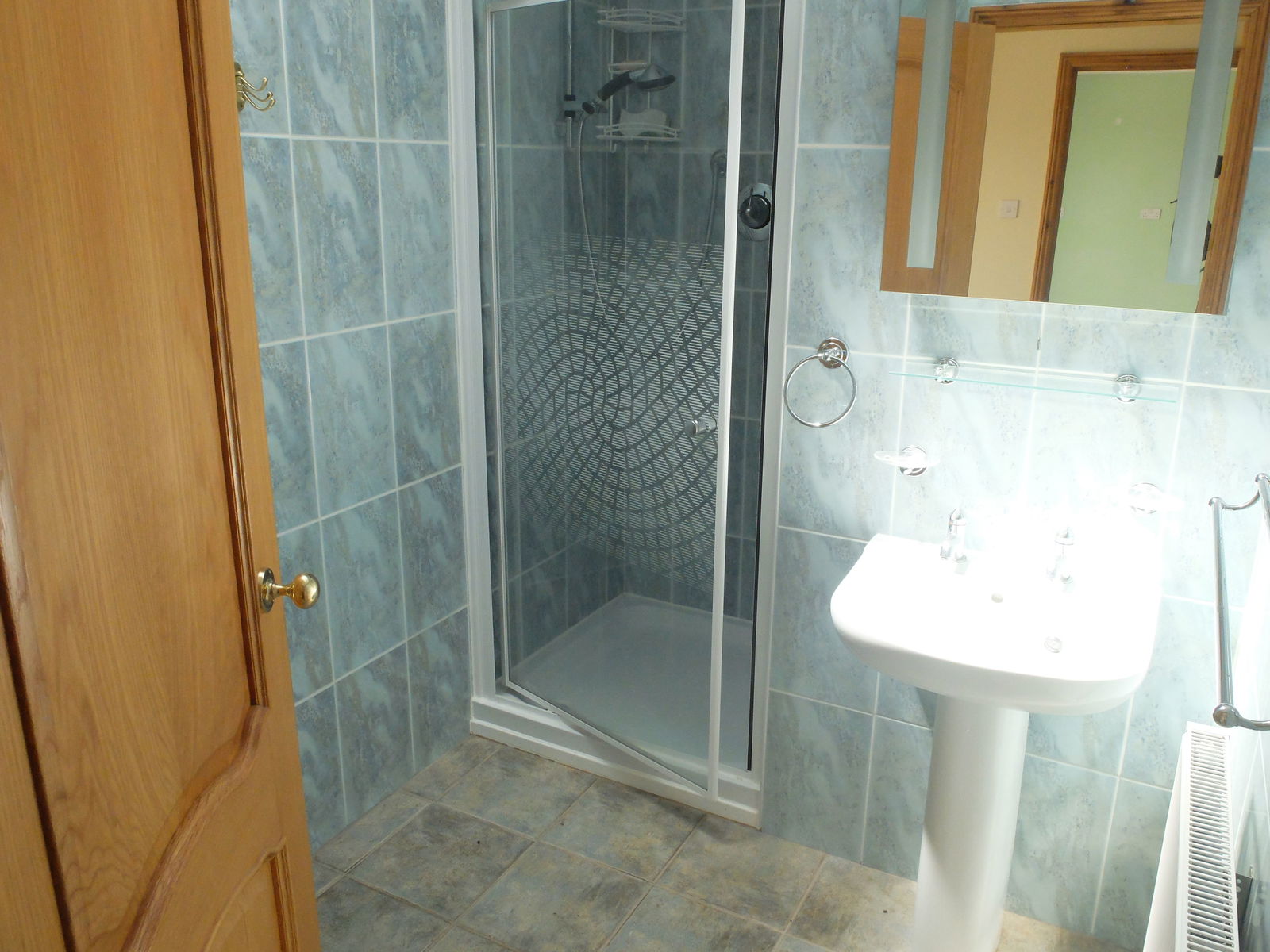 With a white suite comprising a shower cubicle, inset wash basin with cupboard under and a WC. Fully tiled surrounds. Shaver light point. Ventilator. Ladder radiator. Stripped floor. Double glazed window to rear.