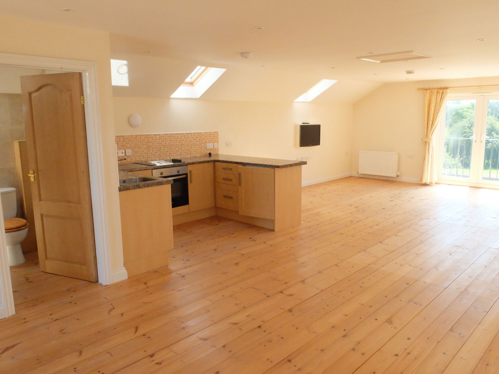 Comprising on the ground floor a large garage area (26'10 x 19'6) with electric roller door, double glazed personal door to front, oil fired boiler and double radiator. There is an adjoining office area with cloakroom off. An external metal staircase gives access to the first floor where there is a large open plan studio / living room (32'8 max. x  19'4 max.) with fitted kitchen area, 3 double radiators, 5 double glazed Velux roof windows and double glazed double doors leading to a balcony from where there are superb views. There is also a shower room off with WC.