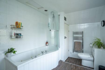 Wood effect flooring, obscured double glazed window, wash hand basin with vanity below, low level WC, P-shaped jacuzzi bath with electric shower over, heated towel rail, storage cupboard, radiator and tiled walls.