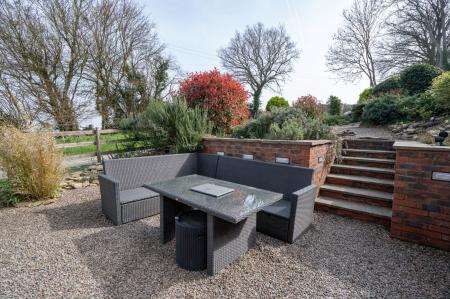 To the rear, a further gravelled area provides access to the conservatory and a useful garden store, completing the outdoor space of this well-appointed home