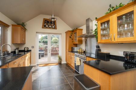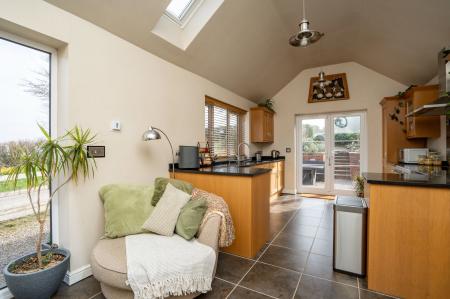 Tiled flooring, double glazed window to front and rear, four roof lights, UPVC front door, double glazed patio door to garden, large area for dining table. Base and eye level units with work surface over, inset sink with mixer tap, space for range cooker with extractor over, under counter fridge and freezer, integrated dishwasher. Open to