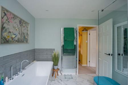 With four spot down lights. Oak framed window to the rear aspect. Walk in shower with tiled surround. Free standing double ended bath with tiled surround. High level toilet. Ceramic sink with undercounter storage cupboard. Chrome heated towel rail. Tiled flooring with electric underfloor heating. Extractor fan.