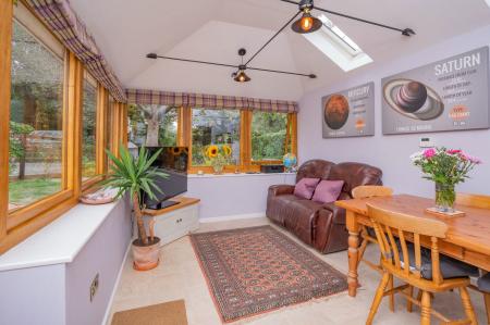 An extended room to the rear of the property, completed in 2024. A vaulted ceiling with two velux windows and oak framed windows to the rear and side aspect, with door opening onto the garden. Three feature light pendants. Tiled flooring with under floor heating. Space for dining table and seating area.