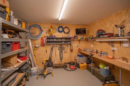 A recently constructed double garage with electric canopy double door. Power and electricity. A separate entrance lobby with double glazed door and internal doors into a WC with light pendant, low level toilet and ceramic sink with tiled back splash. Cupboard housing hot water cylinder. A ground floor workshop with power and electricity. Wall mounted cupboards. Strip lighting and work bench. An external wooden staircase leads to a double glazed front door opening into a space currently being used as additional living accommodation with open plan Kitchenette/sitting room, Shower room and bedroom. Wooden flooring through out and eaves storage cupboards. Electric radiators.
