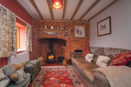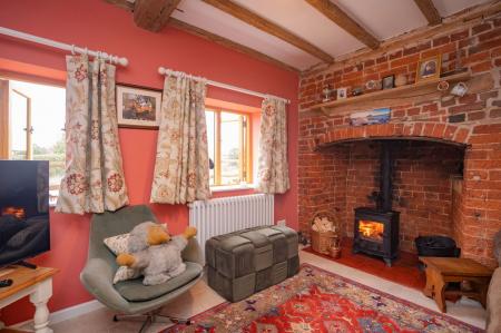 Ceiling light pendant. Exposed beams. Brick built Inglenook fireplace with inset wood burner and tiled hearth. Two oak framed double glazed windows to the front aspect. Tiled flooring. Radiator. TV point.