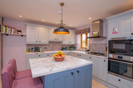 A two tone, shaker style fully integrated kitchen with a range of wall and base units and undercounter down lighting. Marble effect laminate work tops with an inset composite sink and half sink drainer unit and tiled backsplash. Integrated 'Neff' fridge, dishwasher, electric oven and microwave. Inset four ring gas hob. Feature breakfast island with seating and undercounter cupboards. Eight spot down lights and feature light pendant. Tiled flooring. Radiator. Open through into...