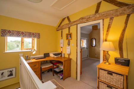 Front facing oak framed window, ceiling light, access to loft space, built in cupboard housing the hot water cylinder. Exposed beams. Radiator. Carpet. Doors to...