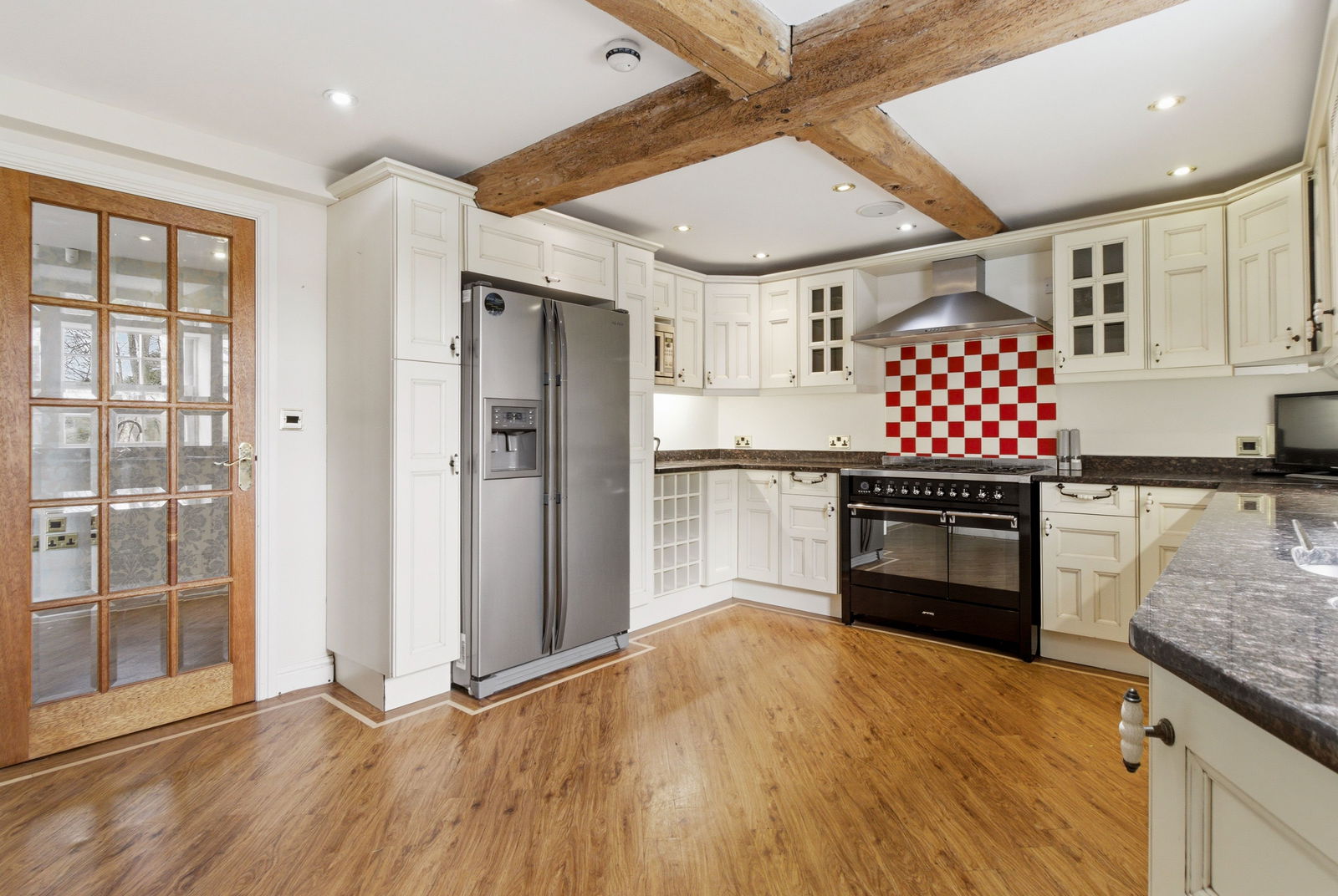 With glass door into a shaker style kitchen with marble counter tops and up stands. Inset stainless steel sink and half sink with draining grooves. 'Smeg' range cooker with six ring gas hob and tiled back splash. Free standing American style fridge freezer. 'Neff' Microwave. 'Hot point' washing machine. Larder cupboard containing fuse board. Boiler cupboard housing 'Worcester Bosch' combination boiler. 15 spot down lights. Sash window to the side aspect. Wood effect laminate flooring. Space for dining table. Exposed beams.