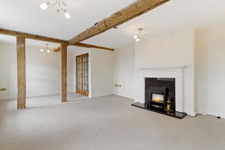 With three wall lights. Three ceiling light points. Two radiators. Carpet. Electric fire with a marble hearth and surround and wooden mantle piece. Three sash windows to the front aspect with countryside views. Exposed beams. Double glass doors into the inner hall.