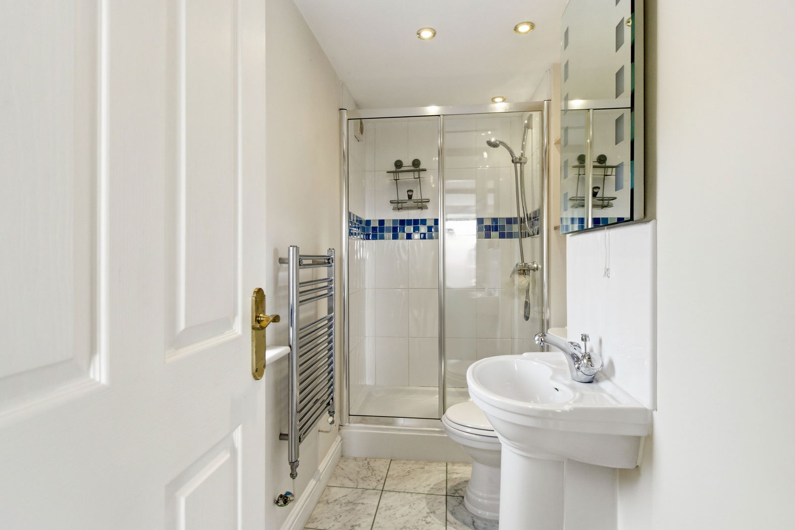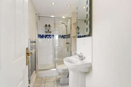 With spot down lights. Double shower cubicle with mains powered over head shower and a tiled surround. Heated chrome towel rail. Ceramic sink with a tiled back splash. Fitted shelving. Tiled flooring. Obscure double glazed window to the side aspect.