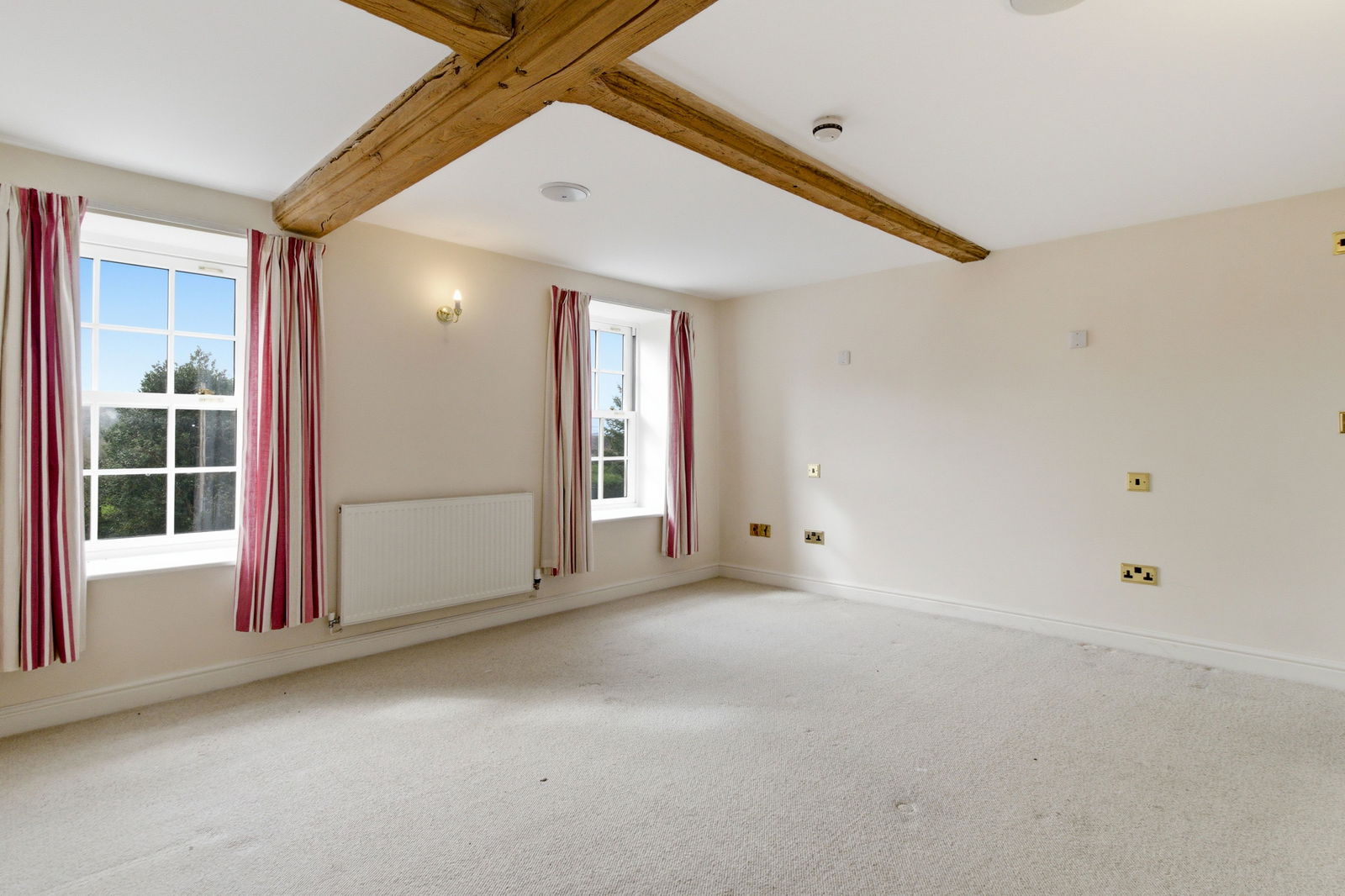 A light and spacious Georgian first floor apartment situated in a rural location enjoying views across open countryside. The accommodation includes a versatile study area leading through to an inner hallway which provides access to all principal rooms. The property offers a well-proportioned sitting room with sash windows to the front aspect and an electric fire with marble surround, alongside a shaker style kitchen breakfast room fitted with marble worktops, a range cooker and space for dining. Exposed beams feature in several rooms, adding character throughout.