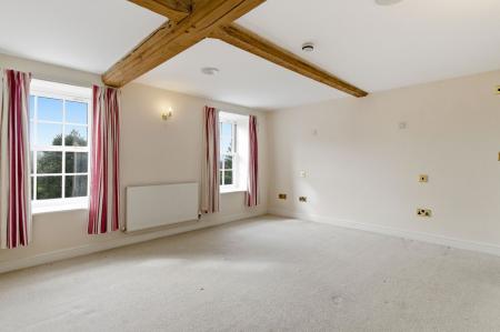 A generous double bedroom with two sash windows and views across countryside to the front aspect. Exposed beams. Two wall lights. Fitted shelving. TV point. Radiator. Carpet. Door into...