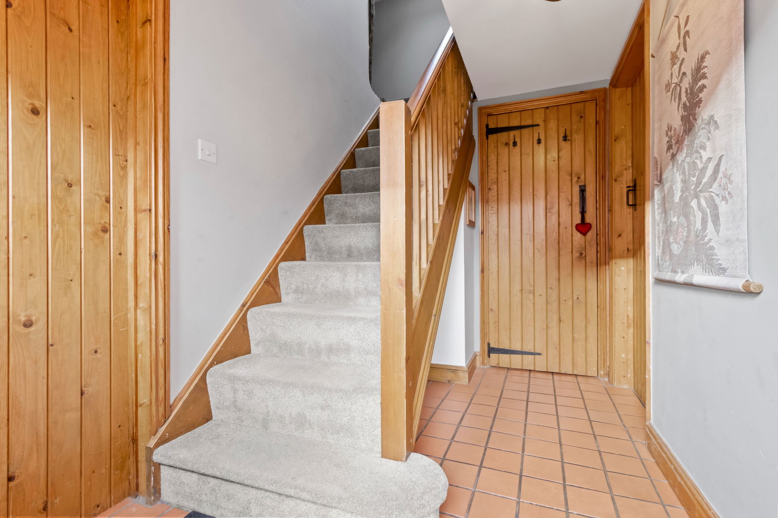 With wooden stable front door. Single radiator. Quarry tiled floor. Stairs to first floor. Understairs recess. Double glazed window to front.