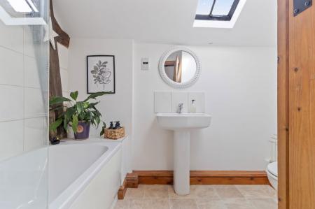 Fitted with a white suite comprising a panelled bath with shower over, fitted shower screen and tiled surrounds, wash hand basin with tiled splashback and a WC. Shaver point. Ventilator. Chrome ladder radiator. Stripped latched door. Double glazed roof window to front.