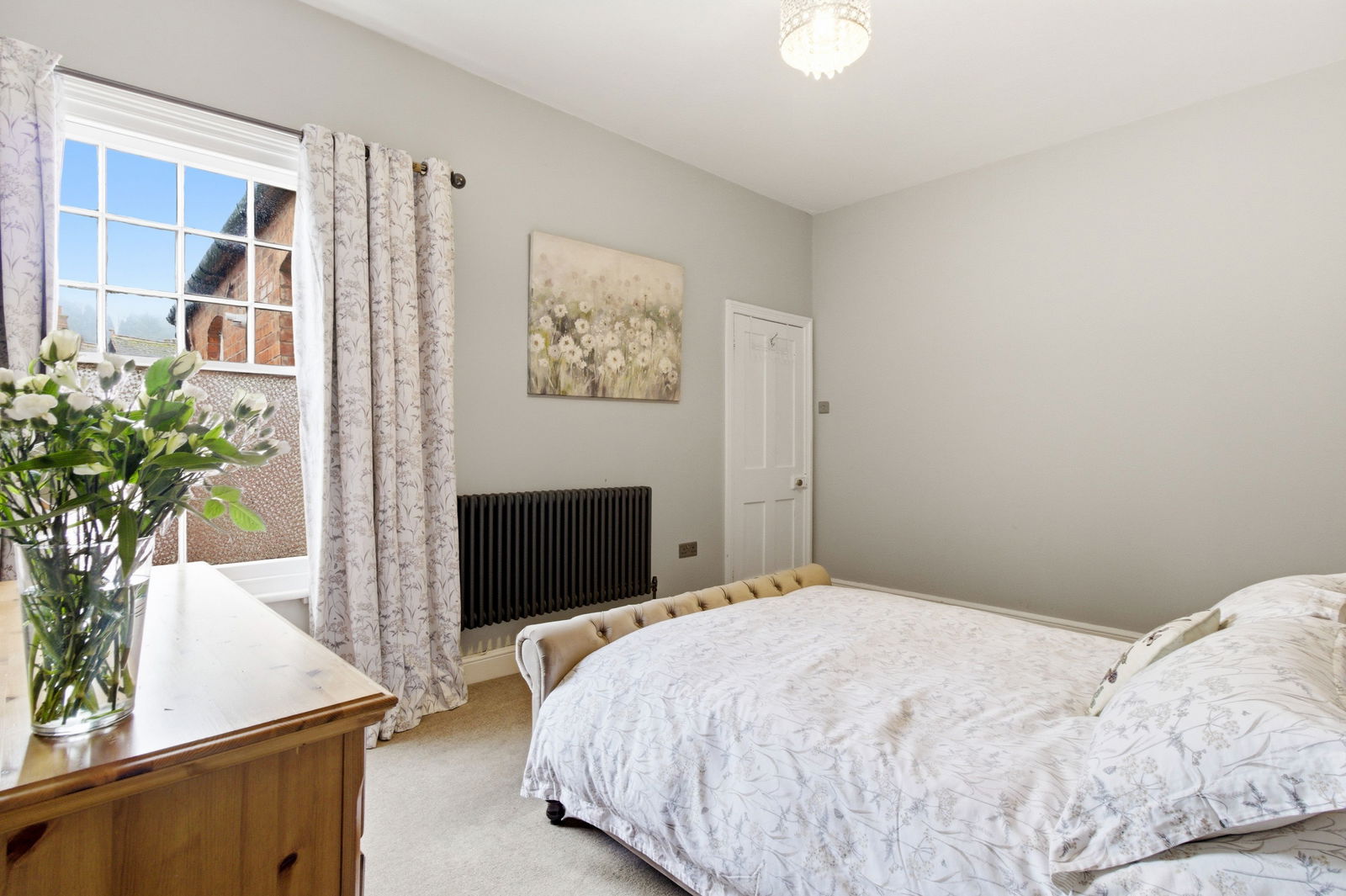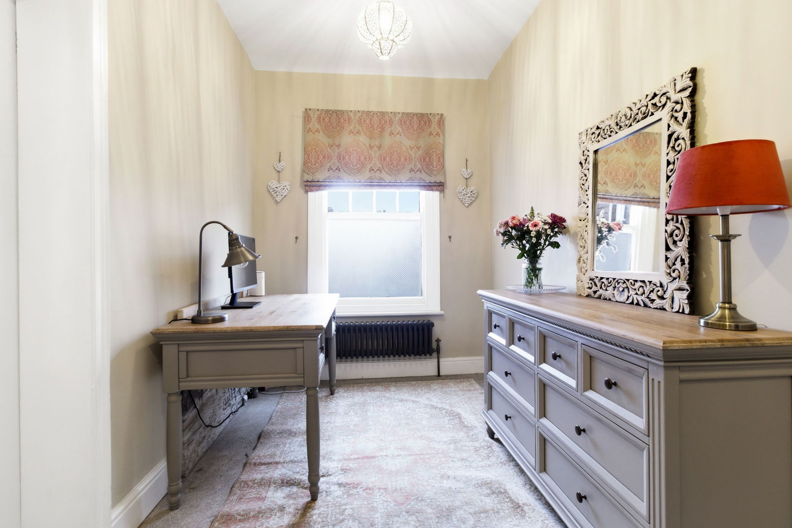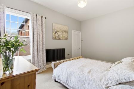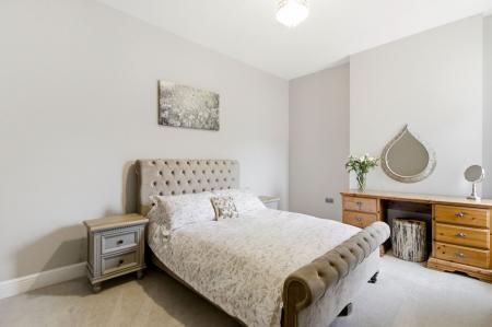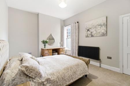 A spacious double bedroom with partially obscure sash window to the rear aspect. Column Radiator. Two ceiling light pendants. Deep skirting boards. Carpet.