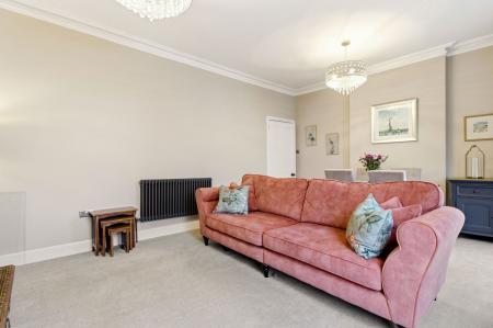 Original wooden door into a spacious and beautifully appointed reception room with two ceiling light pendants. Two large sash windows to the front aspect. Two column radiators. Cornicing and deep skirting boards. Carpet. Chimney breasts with recess's to either side.
