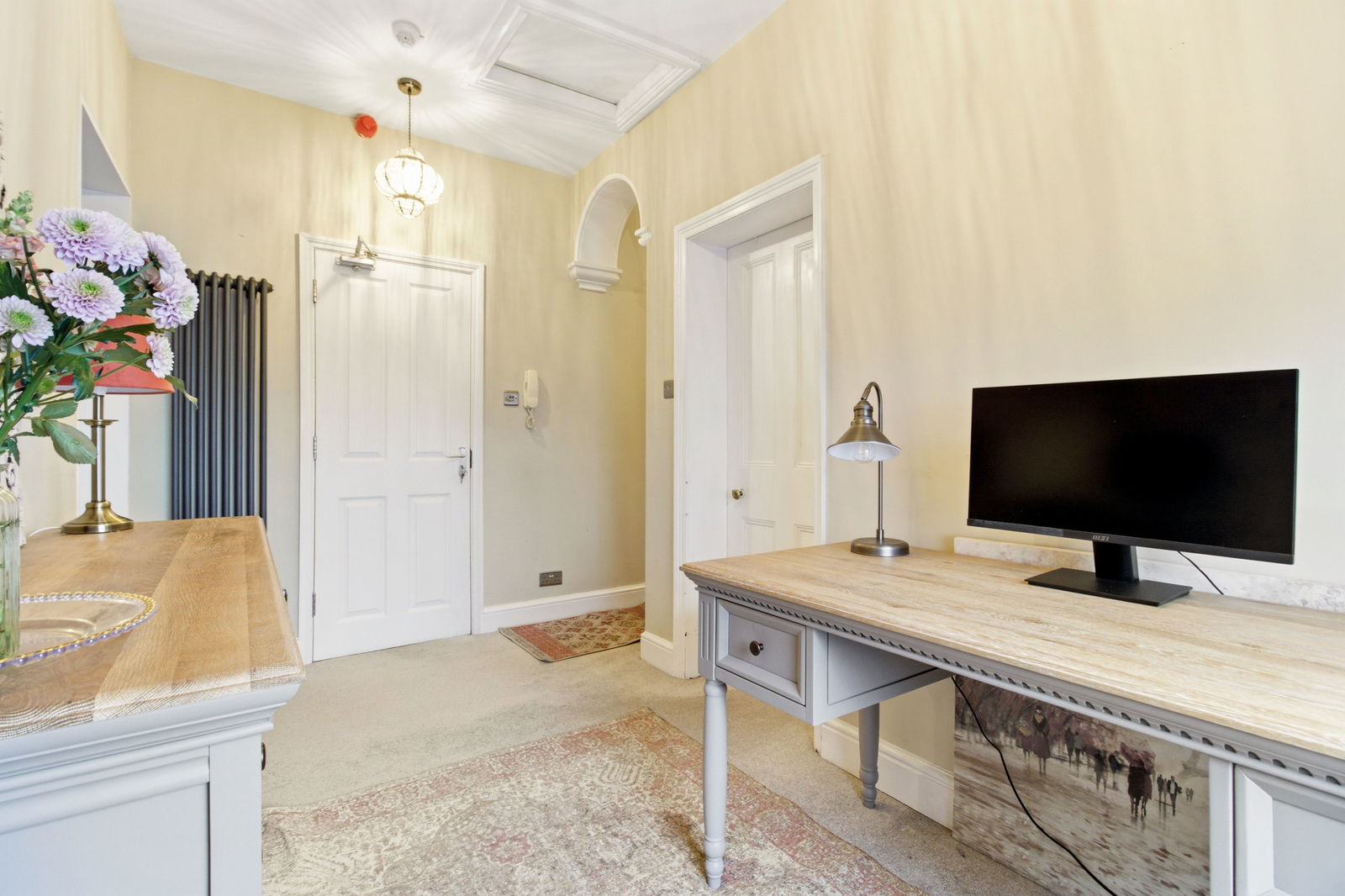 A wooden entrance door opens into a well-appointed hallway which flows into a useful study area, ideal for home working, featuring a side-aspect sash window with fitted blinds and access to the loft space. From here, an archway leads into the impressive sitting and dining room, a spacious and beautifully proportioned reception area with two large sash windows to the front aspect, allowing plenty of natural light. The room also benefits from twin column radiators, decorative cornicing, and chimney breasts with recesses to either side, adding both character and practicality.