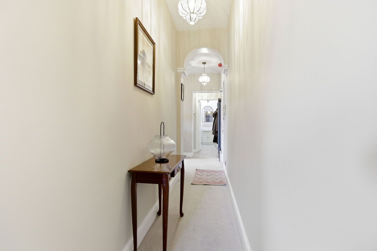 With sash window to the side aspect with fitted blinds. Column radiator. Access into loft space. Two ceiling light pendants. Deep skirting boards. Door into Bedroom. Hallway with feature archway with further ceiling light pendant leading through into...