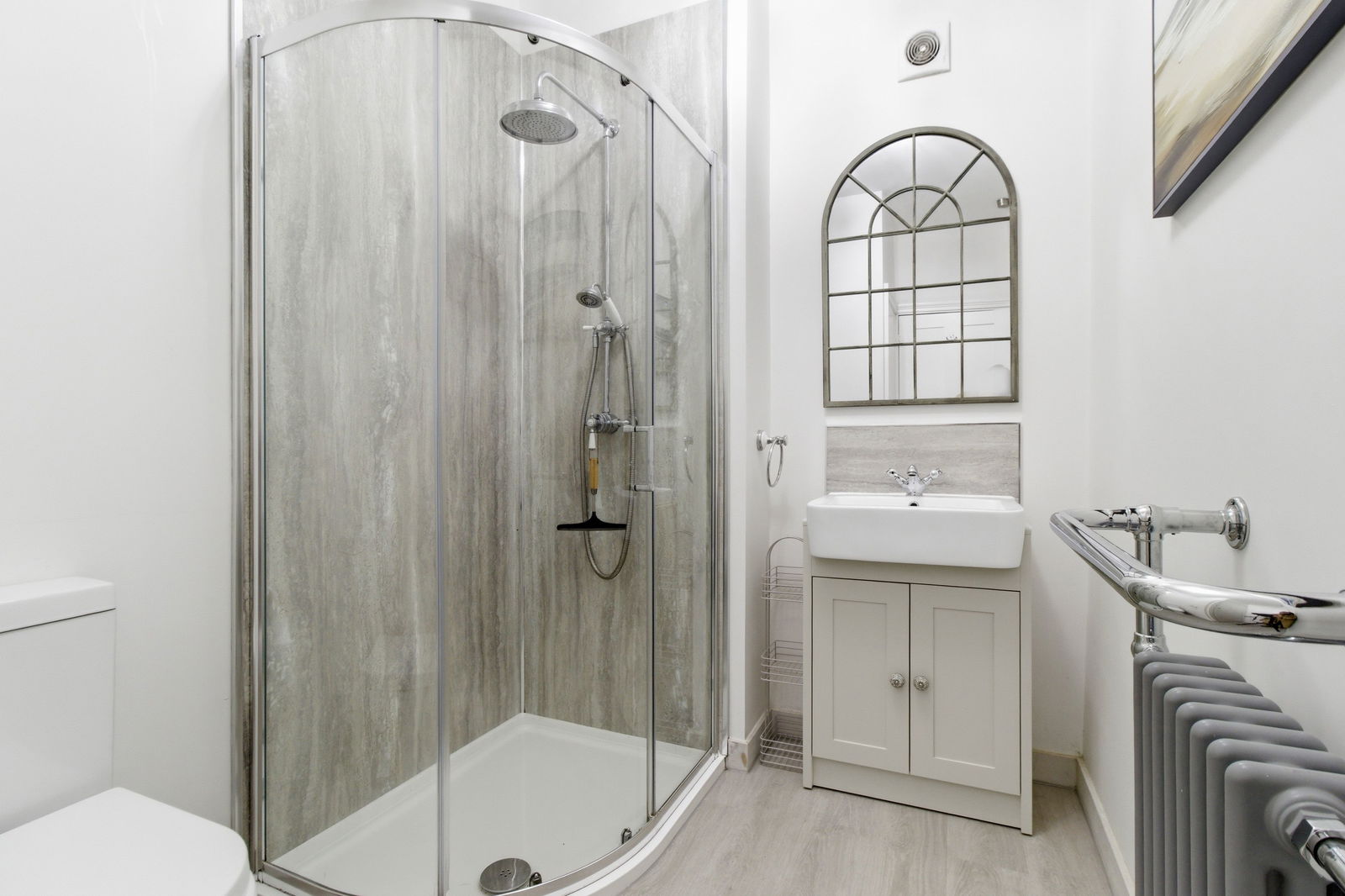 A well appointed and modern shower room with corner shower cubicle with mains powered over head rainfall shower with a panelled surround. Ceramic sink with undercounter storage and a panel backsplash. Heated towel rail with column radiator. Wood effect laminate flooring. Ceiling light point. Useful storage cupboard. Extractor fan.
