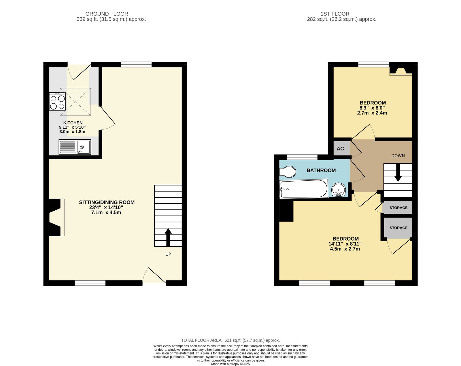 To the first floor are two bedrooms and a bathroom.