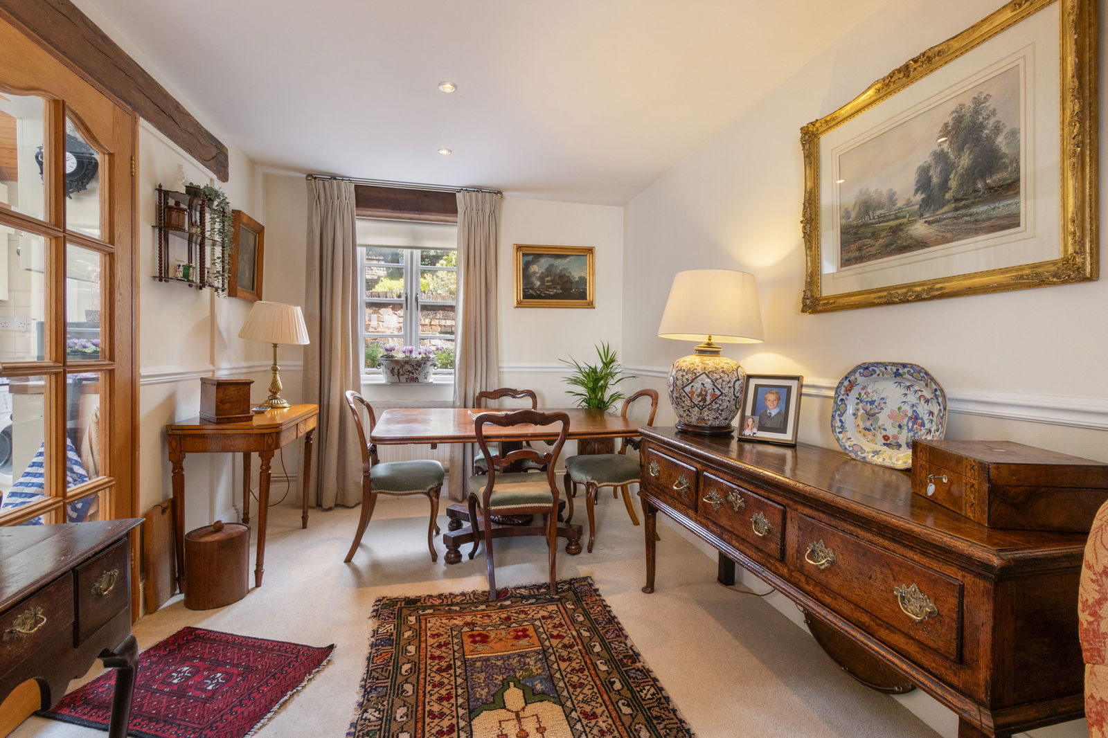 With solid oak entrance door. Fitted matwell. Oak staircase to first floor. Double glazed wooden windows to front and rear aspects. Fireplace with exposed brickwork and alcove fitted shelving. Two radiators. Downlights.