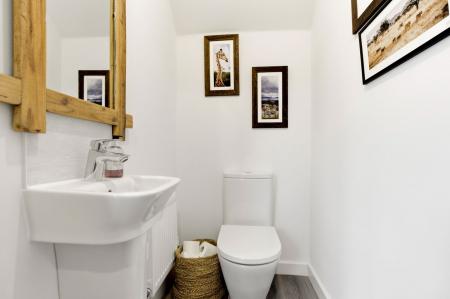 Fitted with a white suite comprising a panelled bath with tiled surrounds, wash basin with tiled splashback and a WC. Shaver point. Extractor fan. Ladder radiator. Double glazed window to rear.