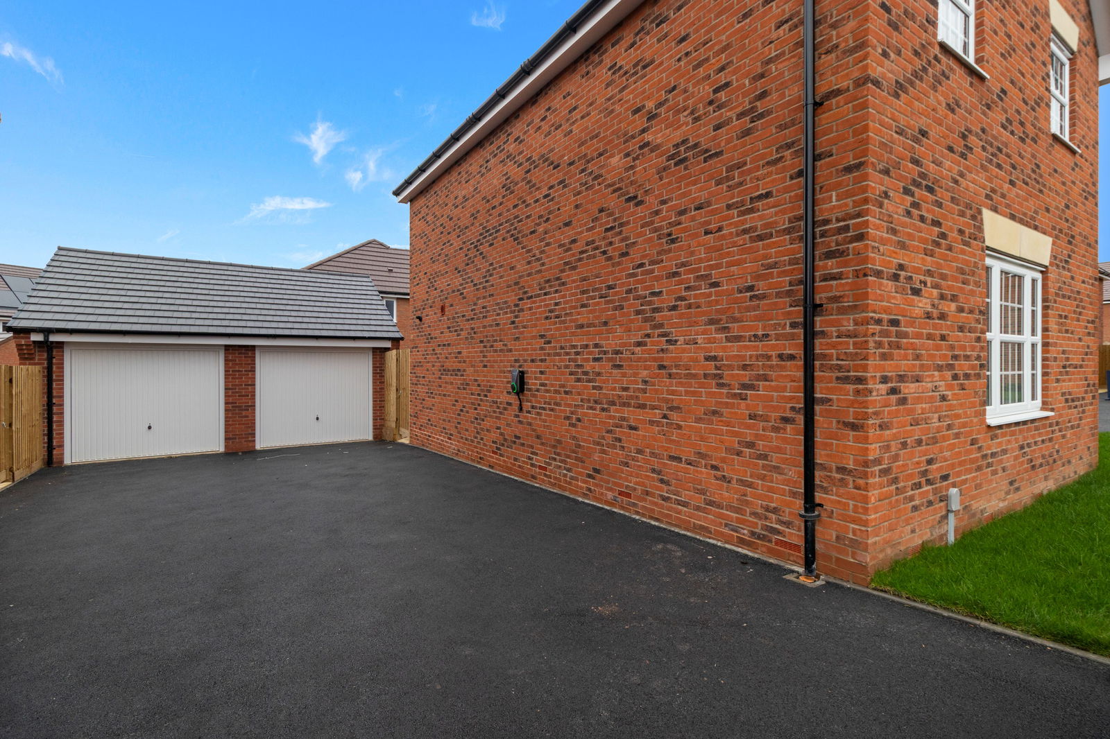A Tarmac driveway offering offroad parking for multiple vehicles with EV charging point in front of a separate garage.