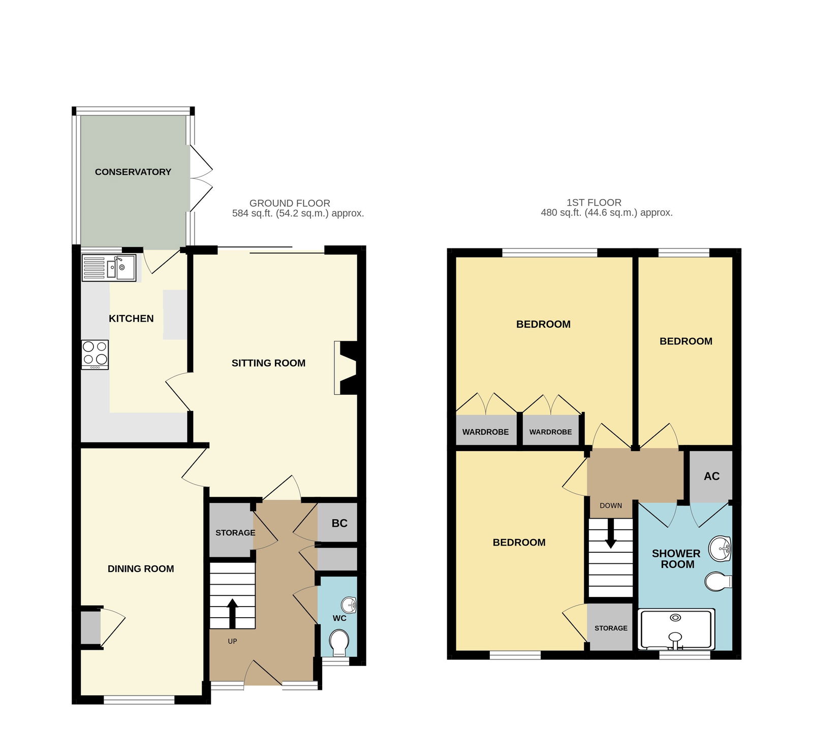 Fitted with a modern white suite comprising an inset wash basin with cupboard under and a WC. Half tiled surrounds. Single radiator. Wood effect flooring. Double glazed window to front.